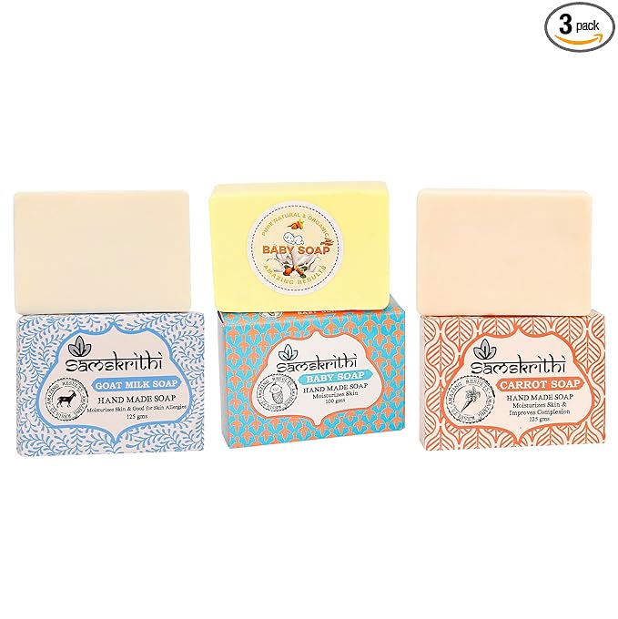 Indulge in the goodness of nature with our Natural Goat Milk, Carrot, and Baby Soap Combo. This skincare trio is thoughtfully crafted to provide a versatile and gentle cleansing experience for your skin. The Goat Milk Soap, known for its moisturizing properties, helps nourish and hydrate the skin, leaving it feeling soft and supple. Carrot Soap adds a touch of natural radiance with its vitamin-rich formula, promoting a healthy glow. Our Baby Soap is carefully formulated to be gentle on delicate skin, making it perfect for your little ones. We prioritize natural ingredients, ensuring that our soaps are free from harsh chemicals and artificial additives. With this skincare combo, you can enjoy a mild and nourishing cleanse suitable for the entire family. Make our Natural Goat Milk, Carrot, and Baby Soap Combo a part of your daily routine for a refreshing and wholesome skincare experience.